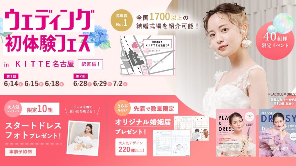 「PLACOLE & DRESSY」ブランドを展開する、冒険社プラコレ(本社:神奈川県鎌倉市、代表取締役CEO:武藤功樹)は、名古屋駅直結商業施設KITTE名古屋3F、ウェディングのテーマパークカフェ"DRESSY CAFE"にて、6/14(土)15(日)18(水)の3日間限定で、これから結婚式をお考えのカップル様に向けた、個室相談やウェディングドレス試着ができる豪華特典付きのウェディング初体験フェスを開催いたします。(40組様限定、無料開催)