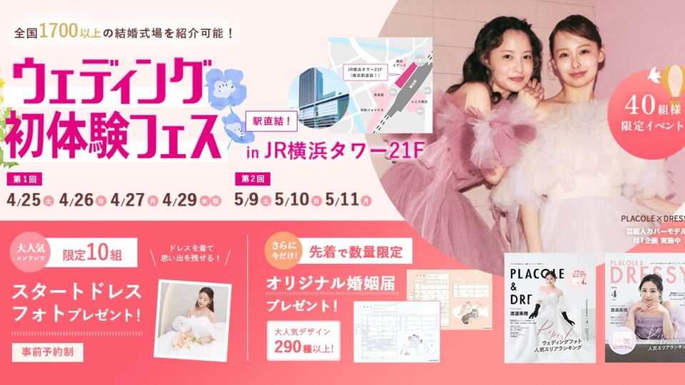 「PLACOLE & DRESSY」ブランドを展開する冒険社プラコレ(本社:神奈川県鎌倉市、代表取締役CEO:武藤功樹)は、横浜駅直結JR横浜タワー21F、ウェディングの魔法にかかる空間"DRESSY ROOM YOKOHAMA"にて、4/25(土)~4/27(月)4/29(祝)限定で、これから結婚式をお考えのカップル様に向けた、個室相談やウェディングドレス試着ができる豪華特典付きのウェディング初体験フェスを開催いたします。(40組様限定、無料開催)