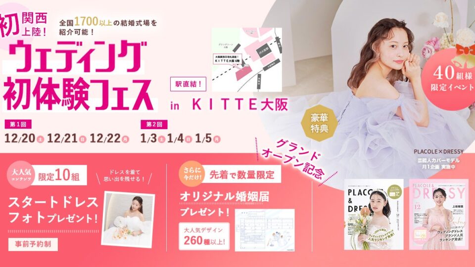 【年内ラスト開催】12/20(土)~12/22(月)結婚準備を楽しく進めるウェディング初体験フェス開催決定 in DRESSY ROOM OSAKA(大阪駅直結)