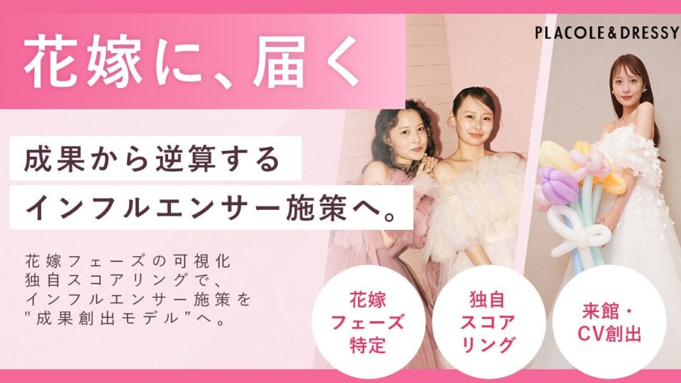 「PLACOLE & DRESSY」ブランドを展開する、冒険社プラコレ(本社:神奈川県鎌倉市、代表取締役CEO:武藤功樹)は、これまで提供してきたウェディング特化型インフルエンサー施策を、花嫁フェーズの可視化と独自スコアリングを掛け合わせた成果創出モデルへと高度化したことを発表しました。