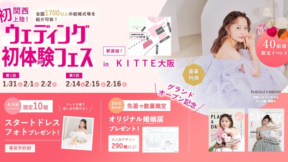 【豪華特典満載】1/31(土)~2/2(月)結婚準備を楽しく進めるウェディング初体験フェス開催決定 in DRESSY ROOM OSAKA(大阪駅直結)