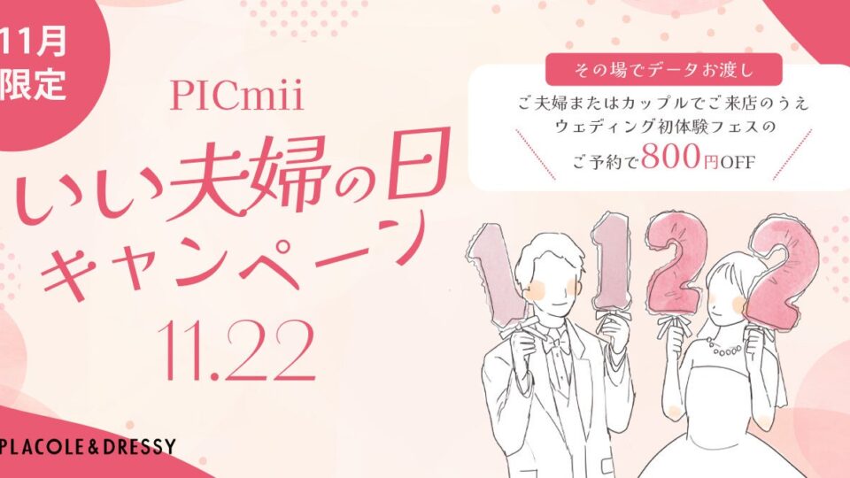 セルフ写真館 PICmiiは、カメラ専門店「カメラのキタムラ」のグループ会社として、撮影画質の仕上がりにこだわったセルフ写真館で、個室での自由な撮影をお楽しみいただけます。DRESSY ROOM YOKOHAMA/NAGOYAスタジオでは『夫婦割キャペーン』を実施することが決定。11月22日はいい夫婦の日。11/1〜11/30までにご夫婦またはカップルでご来店のうえ、ウェディング初体験フェスのご予約をいただいた方限定でご利用料金より800円OFFとさせていただきます。※ご予約時・ご来店時に「キャンペーンの記事を見た」とお伝えください。